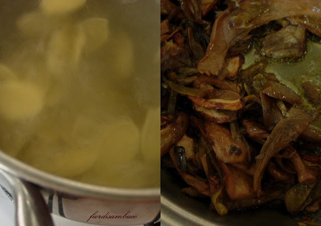 Nel frattempo pulire i funghi, spezzattare quelli più grandi e aggiungerli ai carciofi, continuando la cottura, aggiungendo un po'acqua e aggiustando di sale.