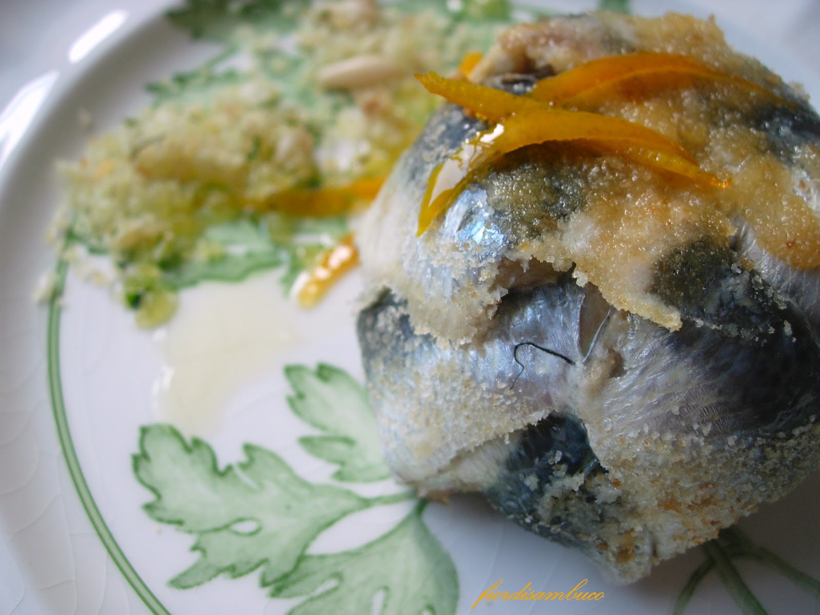 Nota a piè di pagina n. 1: le sardine agghindate così sono uno dei cavalli di battaglia di mia cognata che le aveva preparate come antipasto la prima volta che lei e mio fratello ci hanno invitato a cena; il ripieno è molto simile a quello della sarde a beccafico che a me piacciono molto, ma che non riesco mai a preparare con tutti i crismi perchè non sono capace di arrotolarle (!)...